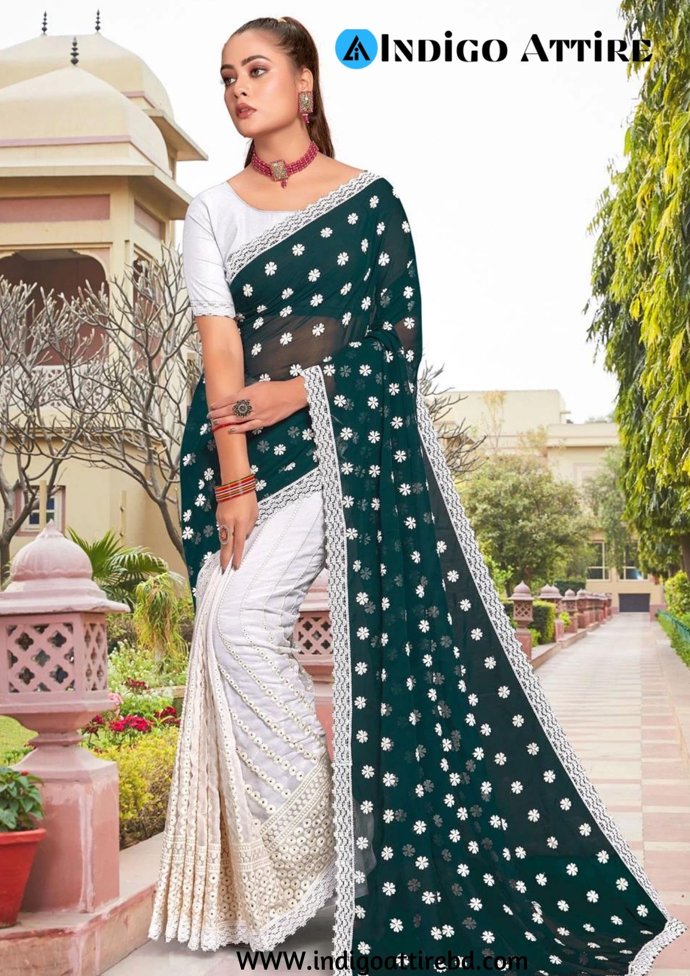 এই সবুজ ও সাদা কালারের শাড়ি টি ইন্ডিয়ান ওয়েটলেস সফট জর্জেট ফ্যাব্রিক দিয়ে তৈরী করা এবং সম্পূর্ণ শাড়ির আঁচল ও কুঁচি জুড়ে সাদা কালার সুতার এমব্রয়ডারি কাজ এটিকে আরও আকর্ষণীয় করে তোলে এবং যেকোনো বিশেষ অনুষ্ঠানের পরিধানের জন্য উপযুক্ত।