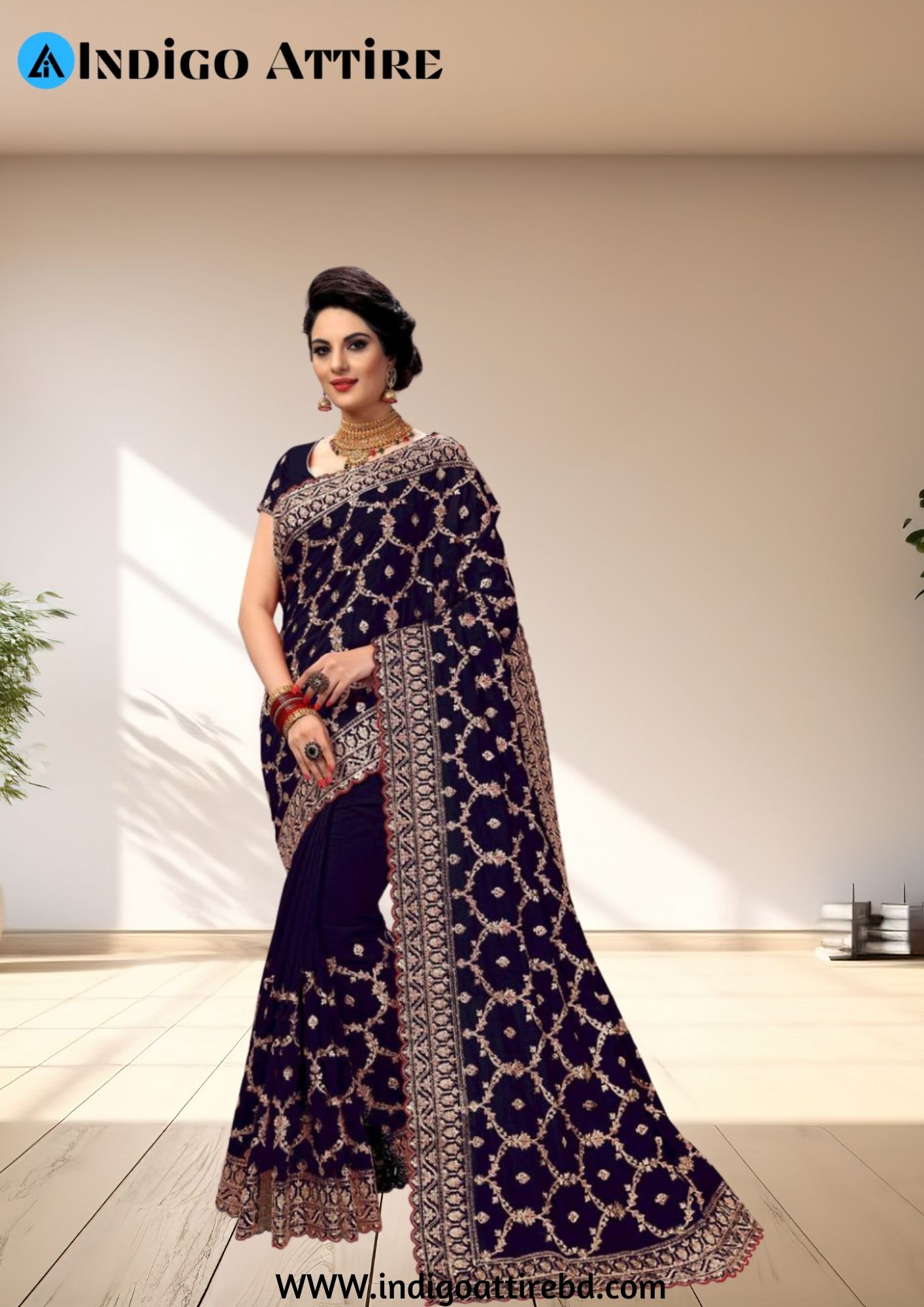 এই নীল কালারের শাড়ি টি ইন্ডিয়ান ওয়েটলেস সফট জর্জেট ফ্যাব্রিক দিয়ে তৈরী করা এবং সম্পূর্ণ শাড়ির আঁচল ও কুঁচি জুড়ে সিলভার কালার সুতার এমব্রয়ডারি কাজ এটিকে আরও আকর্ষণীয় করে তোলে এবং যেকোনো বিশেষ অনুষ্ঠানের পরিধানের জন্য উপযুক্ত।