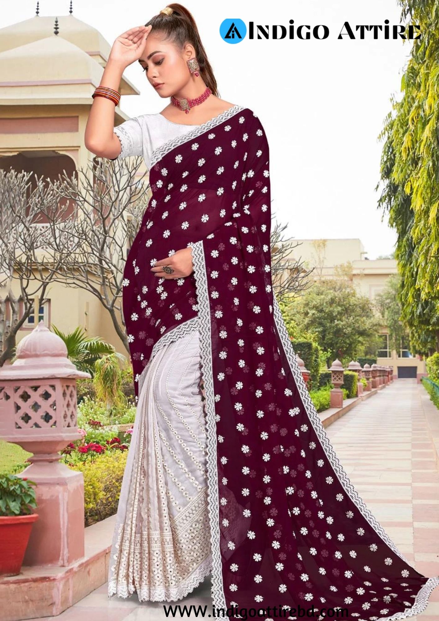 এই পার্পল ও সাদা কালারের শাড়ি টি ইন্ডিয়ান ওয়েটলেস সফট জর্জেট ফ্যাব্রিক দিয়ে তৈরী করা এবং সম্পূর্ণ শাড়ির আঁচল ও কুঁচি জুড়ে সাদা কালার সুতার এমব্রয়ডারি কাজ এটিকে আরও আকর্ষণীয় করে তোলে এবং যেকোনো বিশেষ অনুষ্ঠানের পরিধানের জন্য উপযুক্ত।