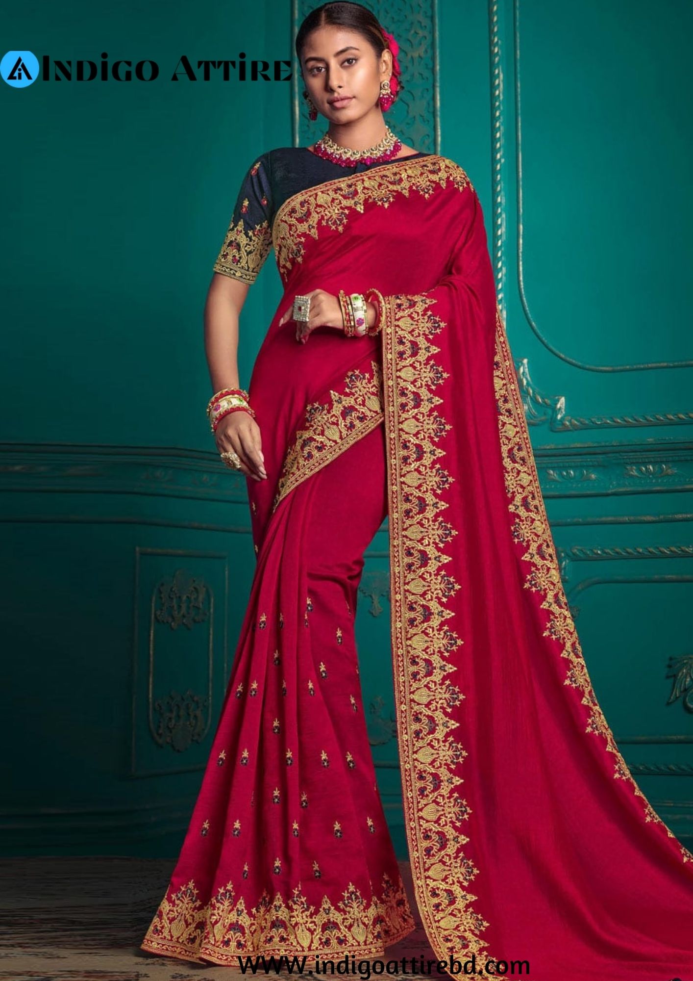 বিঃদ্রঃ এই শাড়িটিতে প্রায় ১৩ হাত পর্যন্ত চওড়া এবং ম্যাচিং করা একটি ব্লাউজের পিস্ থাকবে যা সেলাইবিহীন। আপনার পছন্দ অনুযায়ী সেলাই করে নিতে হবে।
