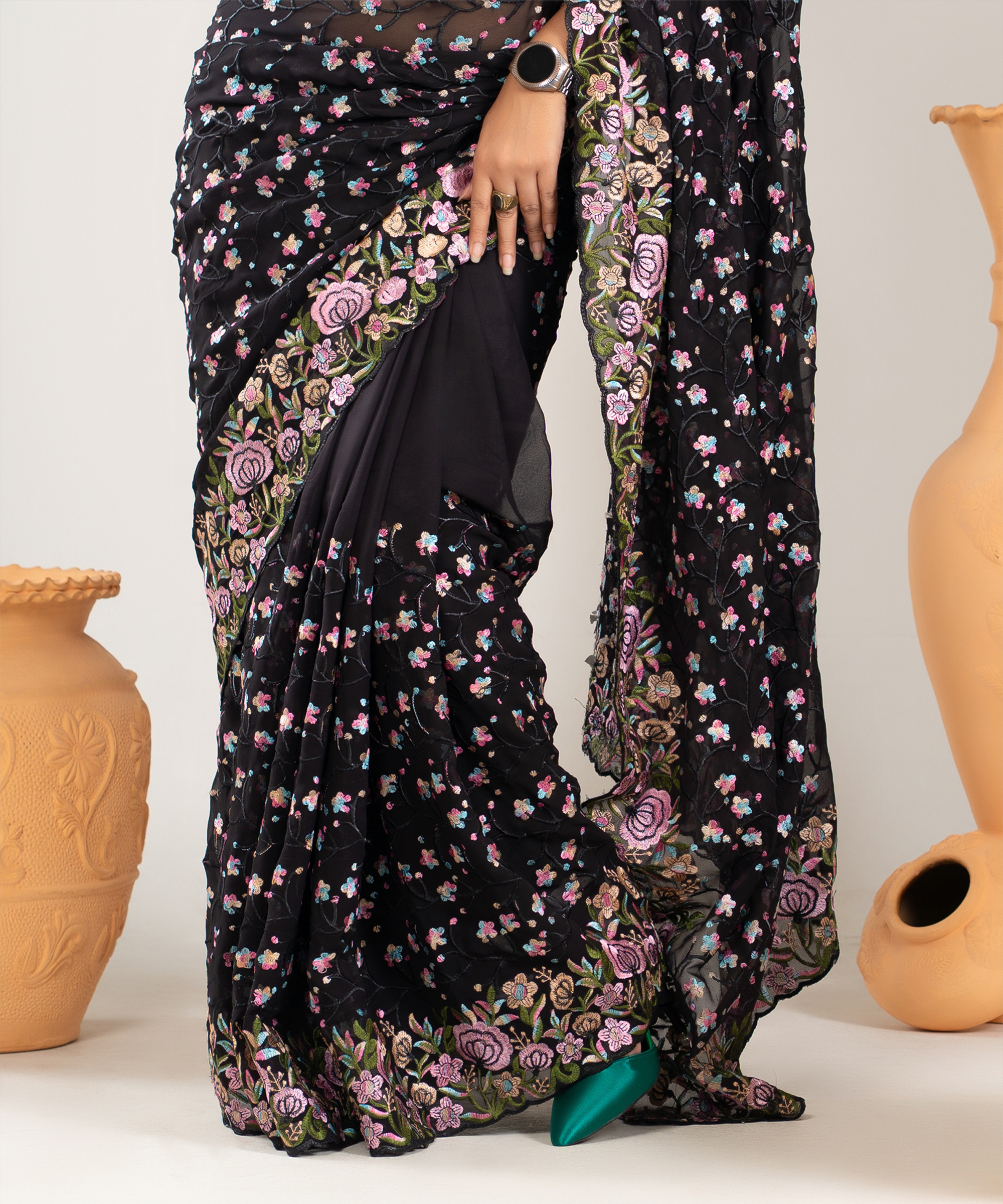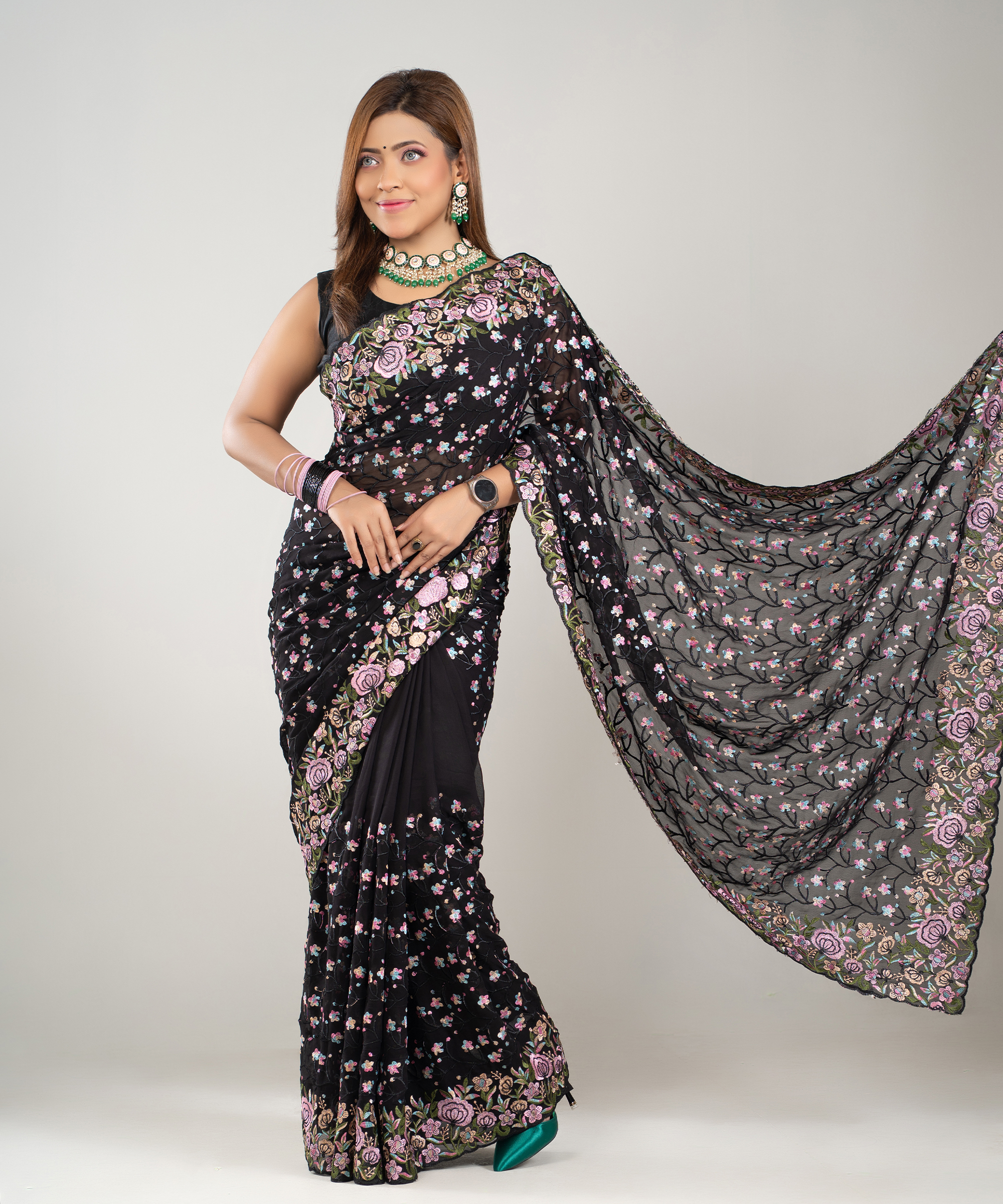 ইমপোর্টেড ওয়েটলেস সফট জর্জেট ফেব্রিকের মধ্যে গর্জিয়াস এমব্রয়ডারি কাজ করা পার্টি শাড়ি।