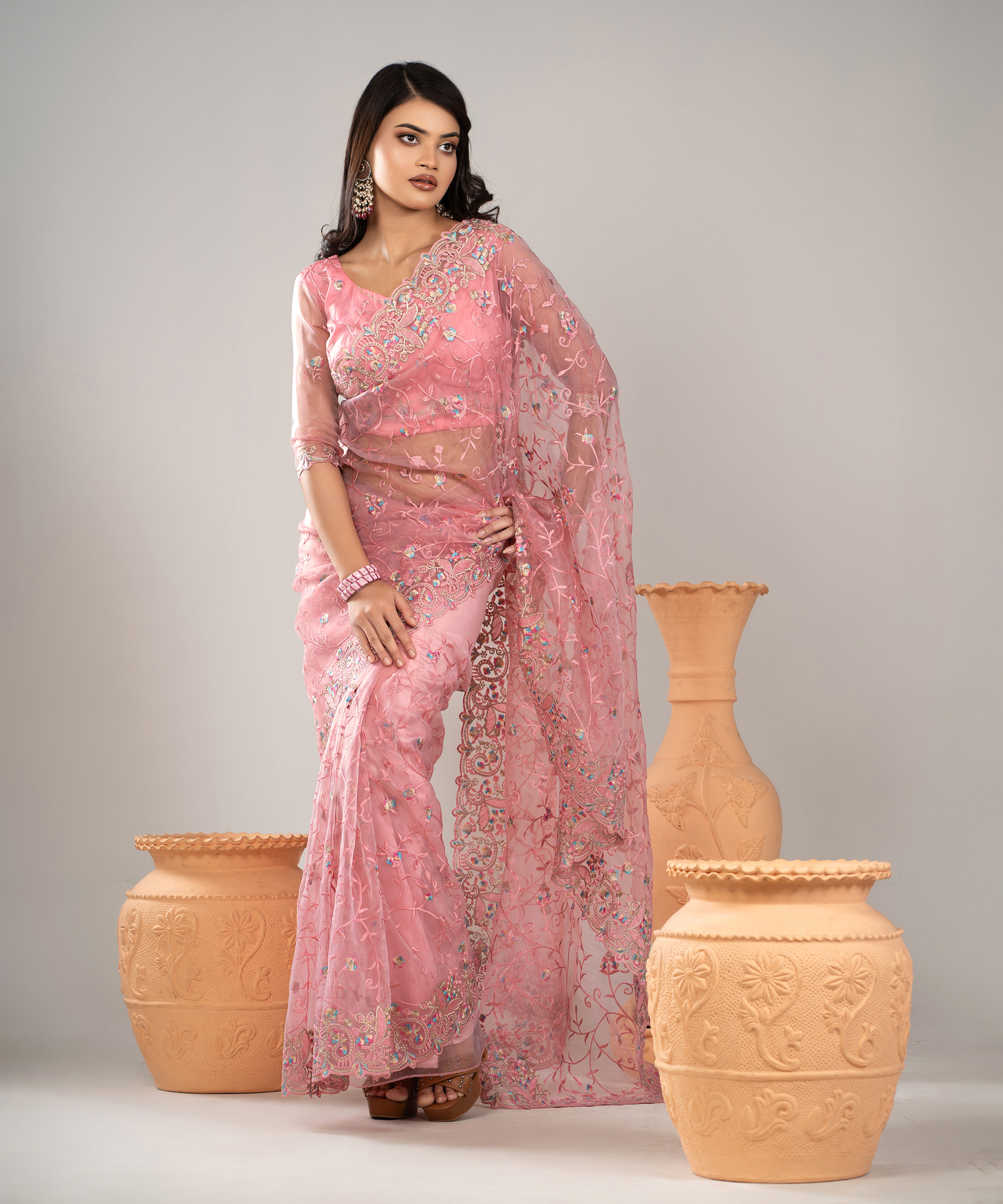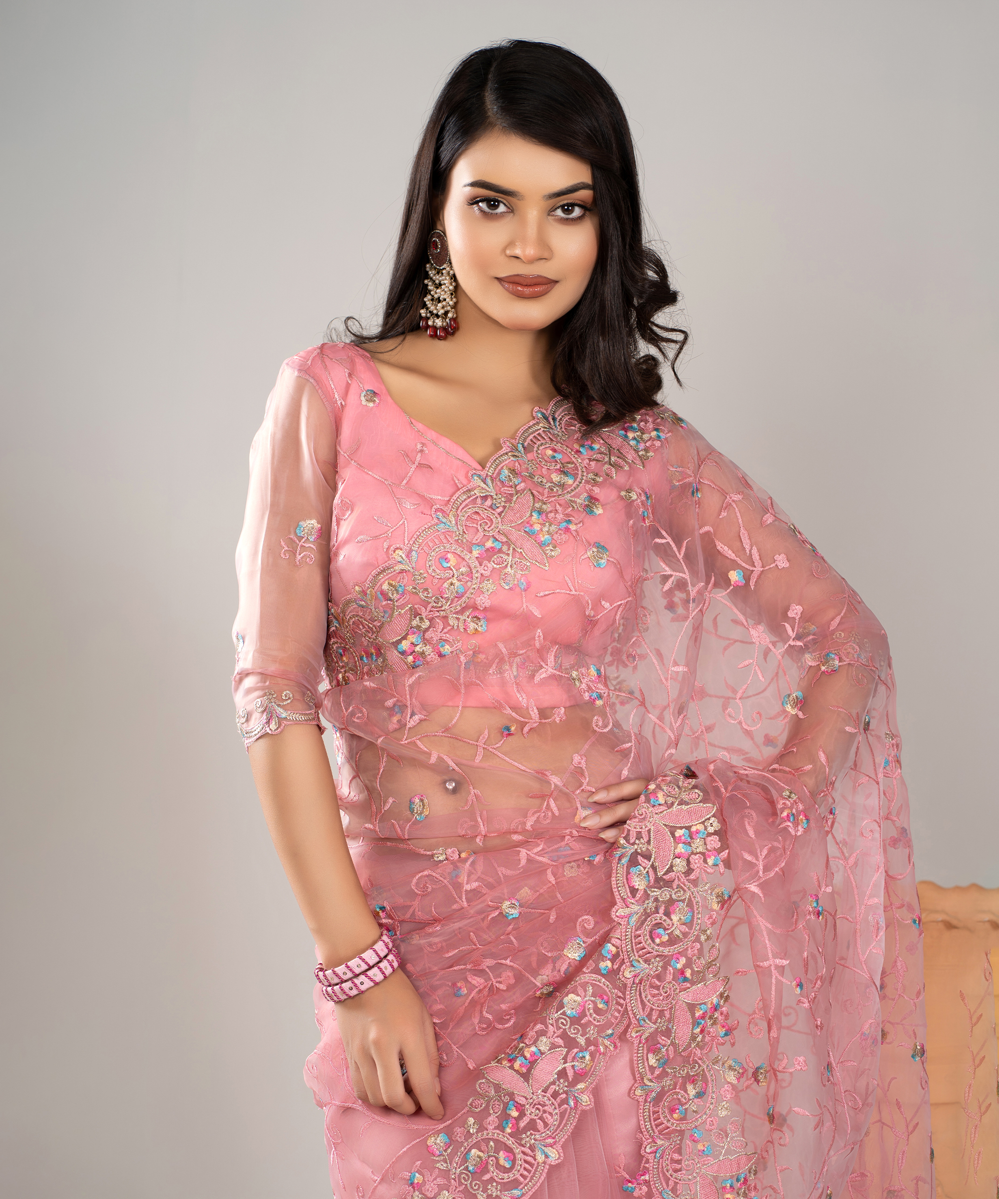 Imported Soft Organza Pink Party Saree With Gorgeous Blouse Piece