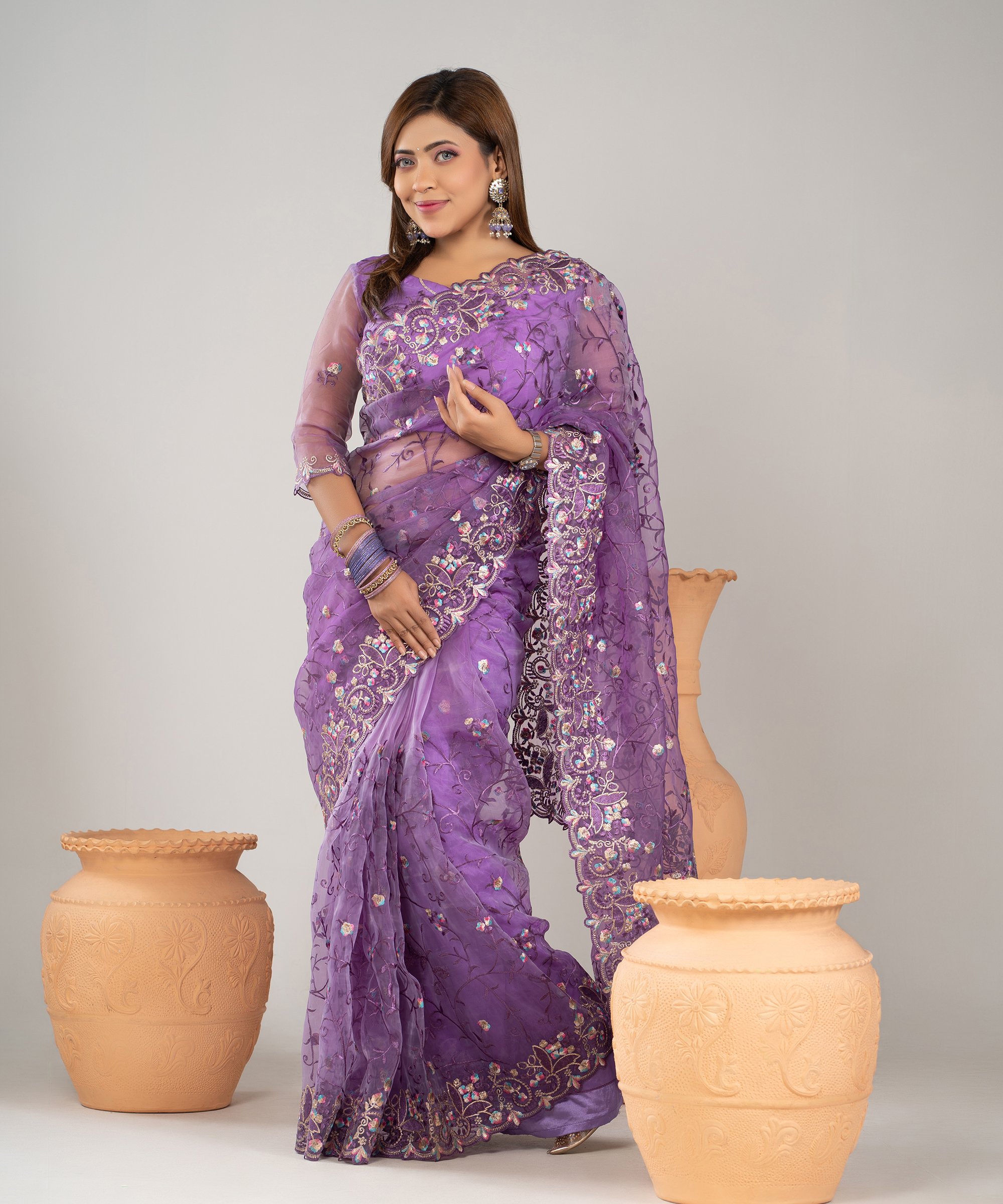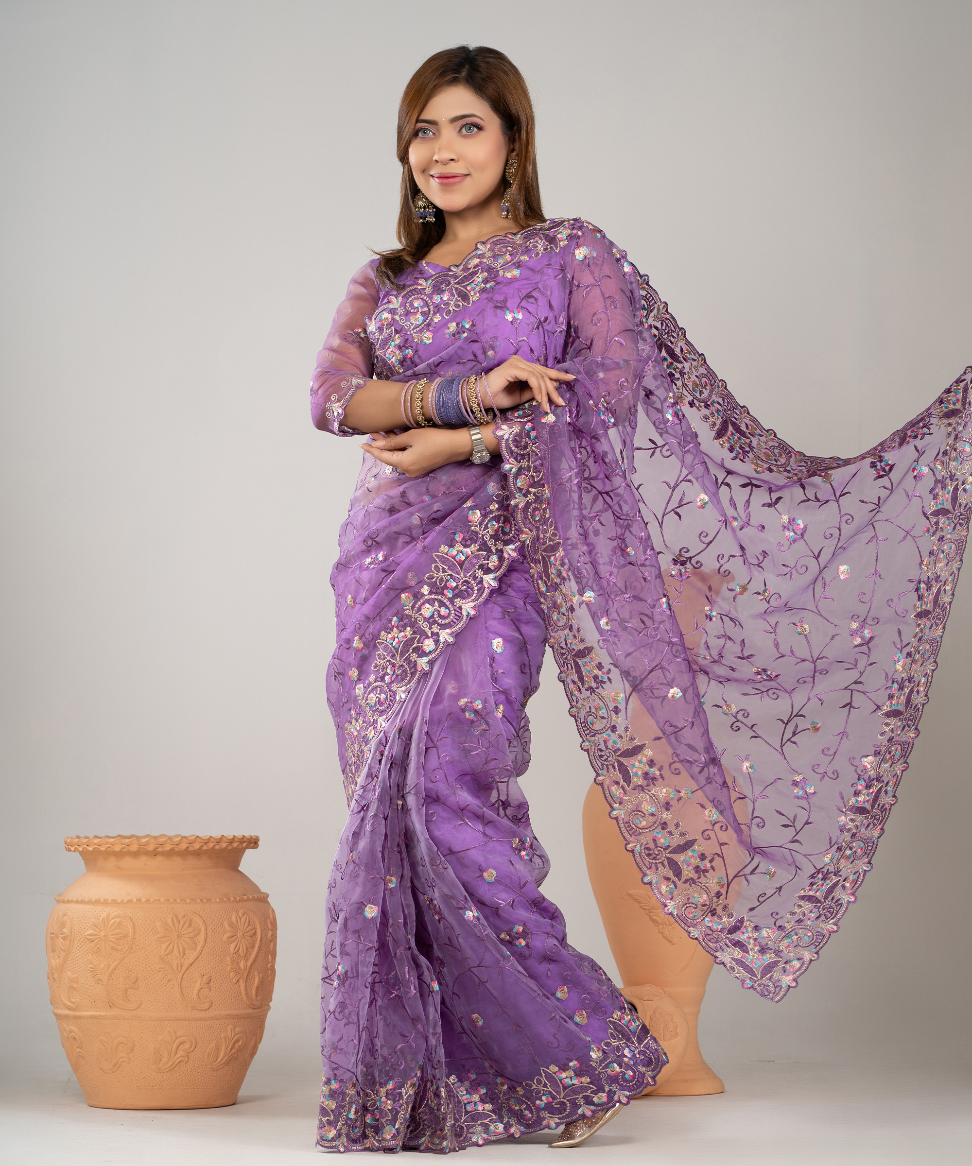 Imported Soft Organza Purple Party Saree With Gorgeous Blouse Piece