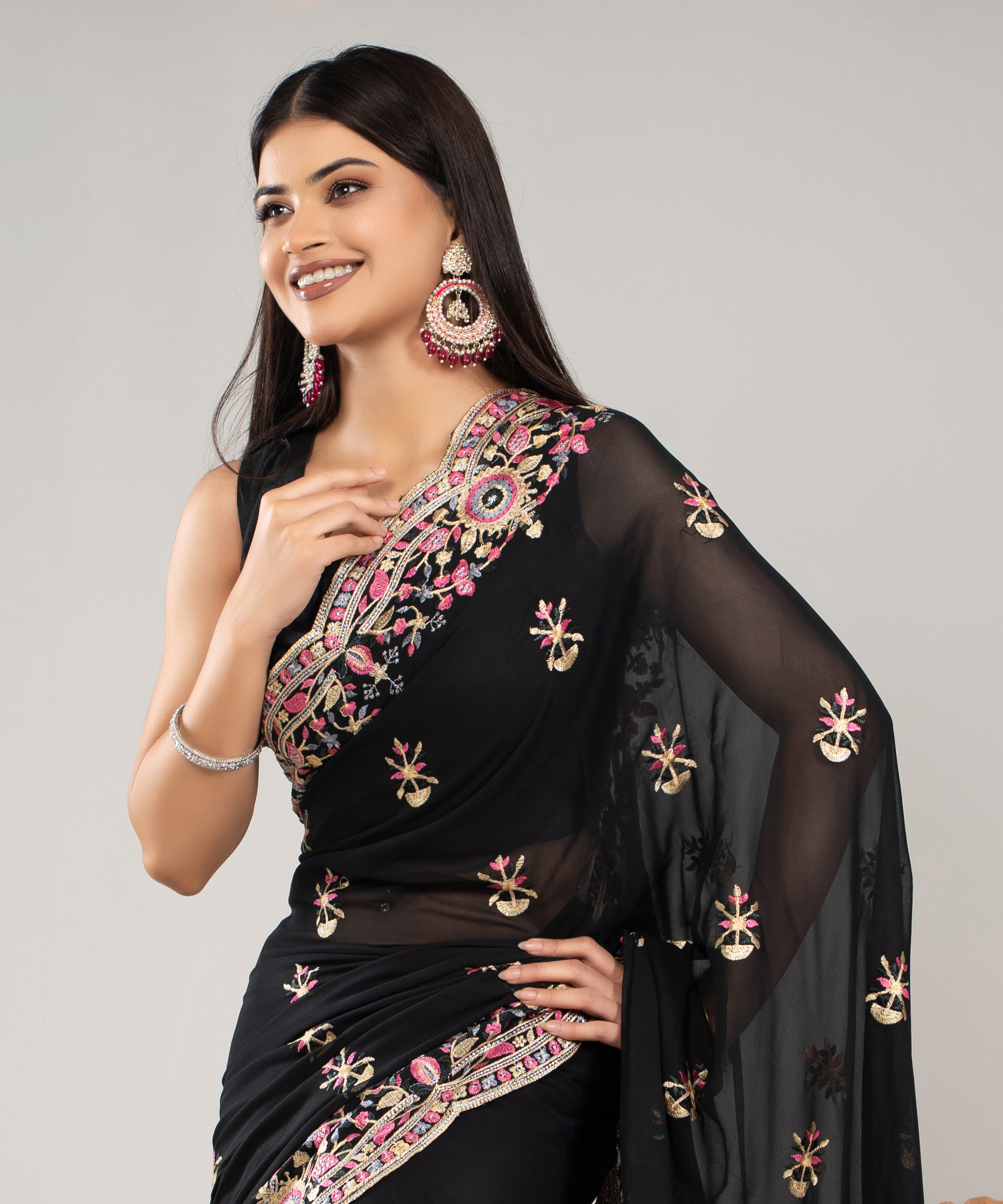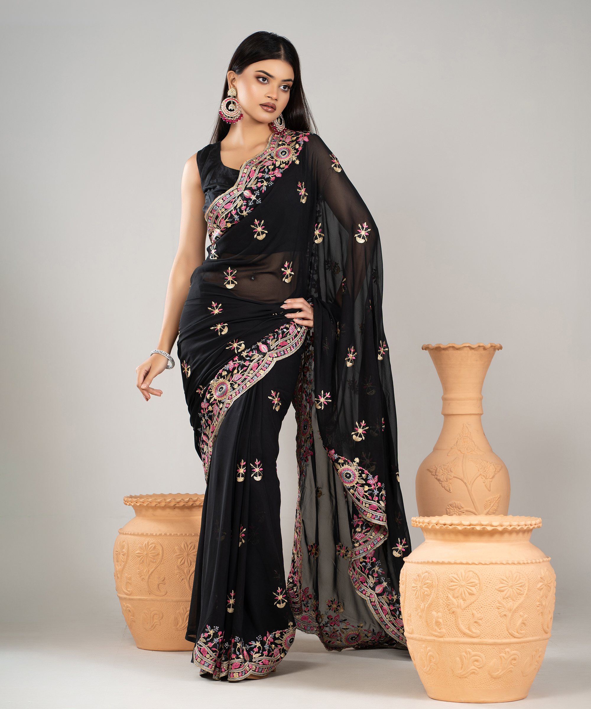 Imported Soft Weightless Georgette Fabric Black Embroidery Party Saree With Blouse Piece