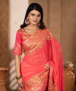 Imported Soft Weightless Georgette Fabric Coral Pink Embroidery Party Saree With Blouse Piece