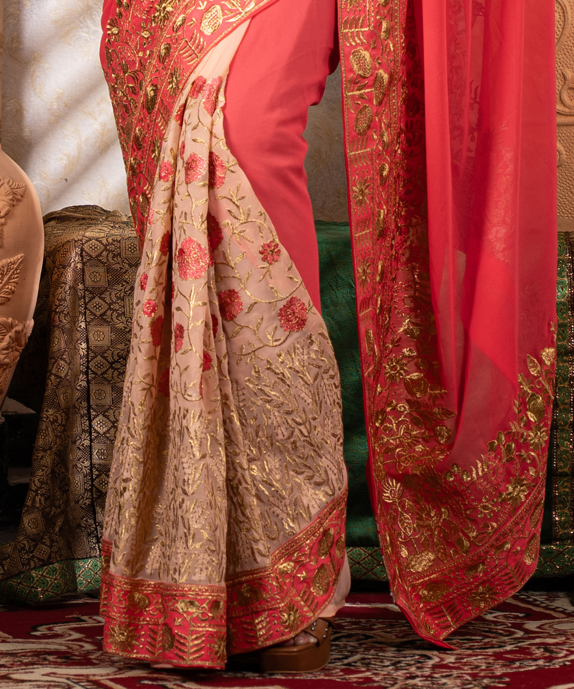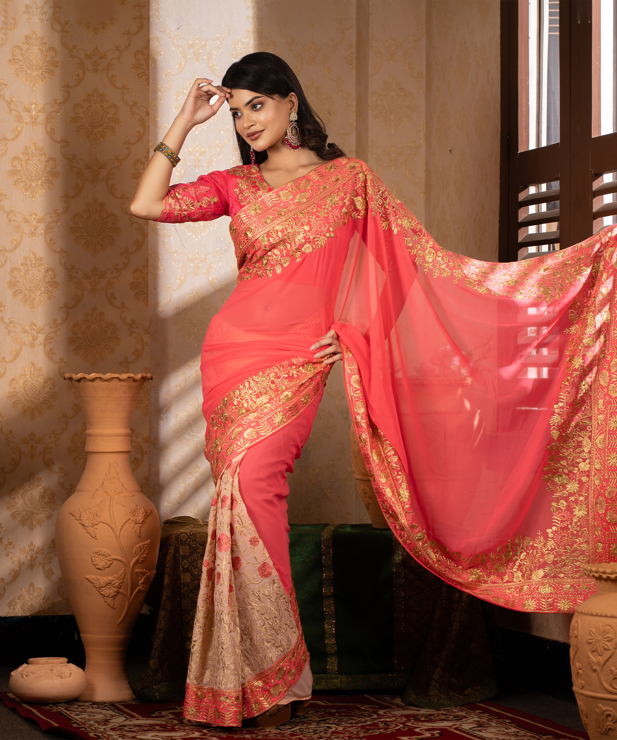 Imported Soft Weightless Georgette Fabric Coral Pink Embroidery Party Saree With Blouse Piece